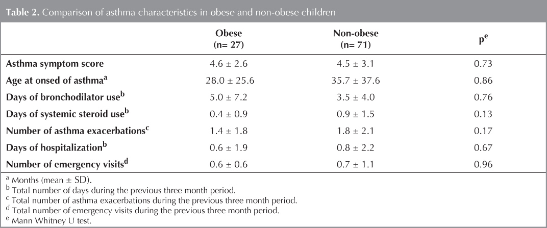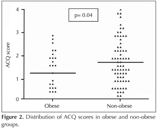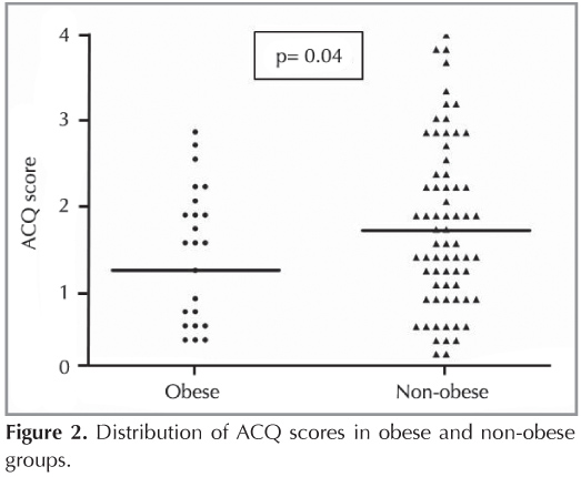 Materials and Methods: We enrolled 98 children with asthma aged 4 to 14 years consecutively and recorded their disease characteristics and severity parameters as well as the symptom scores. All children filled in the ACQ. Children were classified as obese and non-obese according to body mass index. Obesity was defined as body mass index over 90th percentile.