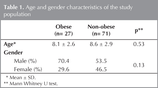 Mean age of the children in the obese group (n= 71) was 8.1 ? 2.6 while that in the non-obese group (n= 27) was 8.6 ? 2.9 (p= 0.53). Gender distribution was similar between the two groups (p= 0.13) (Table 1).
