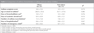Obese and non-obese children with asthma reported similar number hospitalization days, asthma exacerbations, days of bronchodilator requirement and emergence/department visits during the previous three month period. This was in concordance with the lack of difference between ACQ scores when adjusted for age and sex.