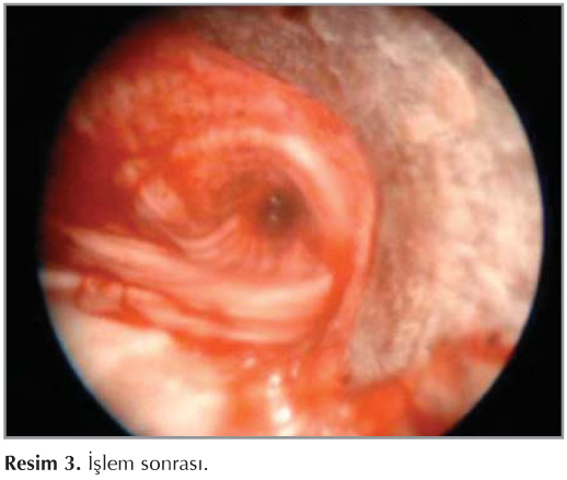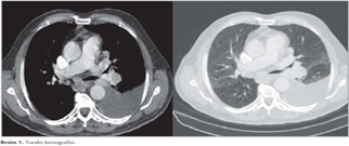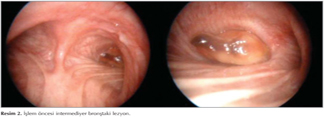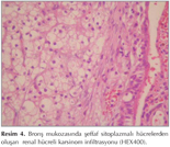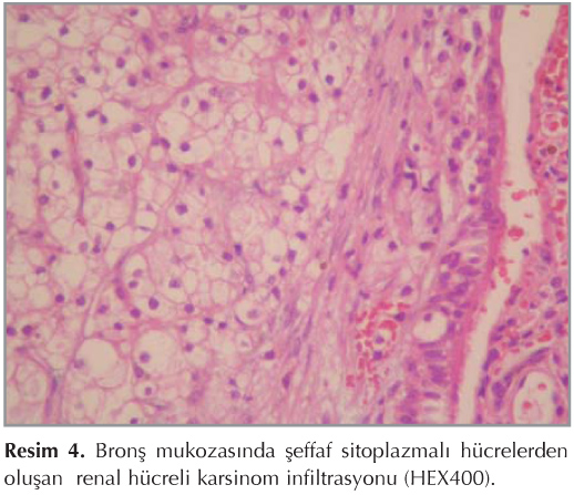 Yetmi? iki ya??nda, erkek hasta, May?s 2013 tarihinde sol yan a?r?s? ve hemoptizi ?ikayetiyle klini?imize ba?vurdu. Mevcut ?ikayetleri iki ay i?inde artan hastada d?? merkezde ?ekilen toraks ve abdomen tomografilerinde mediastinal lenfadenopatiler, sol akci?erde masif plevral ef?zyon i?inde ve parankimde multipl metastatik lezyonlar, sol b?brekte 126 mm nekrotik, egzofitik renal sinusa invazyon yapm?? malign kitle lezyonu ile sol surrenal lojda 24 mm'lik heterojen kitlesel lezyon saptand? (Resim 1). Hastan?n al?nan plevral s?v?s? malign sitolojiyle uyumlu olarak gelmi?. Hastaya sol b?brekten yap?lan tru-cut biyopsi sonucunda renal h?creli karsinom (?effaf h?creli tip ile uyumlu) saptanm??t?r. Hastaya yap?lan fiberoptik bronkoskopide sa? intermediyer bron?u tama yak?n t?kayan lezyon g?r?lmesi nedeniyle giri?imsel bronkoskopi yap?lmak ?zere hastanemize y?nlendirilmi?tir. Hastaya genel anestezi alt?nda rijid bronkoskop ile alt lob apikal segmentten kaynaklanan ve intermediyer bron?u tama yak?n t?kayan polipoid EBL 60 watt argon ile koag?le edilerek rijid forcepsle ??kar?ld? ve i?lem sonras? orta ve alt lob segmentlerinde tam a??kl?k sa?land? (Resim 2,3). Lezyondan al?nan biyopsi sonucu renal h?creli karsinom ile uyumlu olarak geldi (Resim 4).