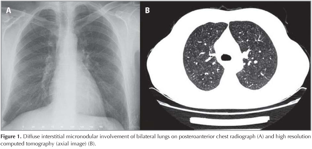 A 45-year-old male admitted to our clinic for cough and dyspnea. In his previous history, he worked at quartz mine eight hours per day for 15 years. Physical examination was not remarkable. Posteroanterior radiograph and chest computed tomography findings were consistent with pulmonary silicosis (Figure 1). Spirometry results (FEV1: 96%, FVC: 95%, FEV1/FVC: 82 MEF25-75: 94%) and the diffusing capacity for carbon monoxide (DLCO: 119 mmol/kPa/min) were normal. T-score of femoral neck was -2.99 (0.7338 g/cm2) and that of lumbar 2-4 vertebra was -3.17 (0.7186 g/cm2) in his bone mineral densitometry. He was 177 cm tall and weighed 70 kg. He had no history of osteoporosis risk factors (medical and drug history, smoking, coffee-alcohol consumption, immobility). Laboratory findings for secondary causes of osteoporosis including complete blood count, erythrocyte sedimentation rate, liver and renal function tests, thyroid and parathyroid hormone levels, prolactin, free testosterone, immunoglobulin-E and beta-2 microglobulin, calcium, phosphor, alkaline phosphatase, 25-OH vitamin D, plasma cortisol level, gonadotropins, parathyroid hormone levels and urine tests were all normal except for the high level of serum osteocalcin (24.99 ng/mL "N: 3.1-13.7 ng/mL"). Moreover, the patient did not reveal a history of malabsorption. Total protein and albumin levels were normal. After all, the patient was diagnosed as silicosis and secondary interstitial lung disease and secondary osteoporosis possibly due to silicosis intoxication. In addition to calcium rich diet and exercise, alendronate 70 mg/week and a daily calcium 600 mg plus vitamin D 400 IU were prescribed.