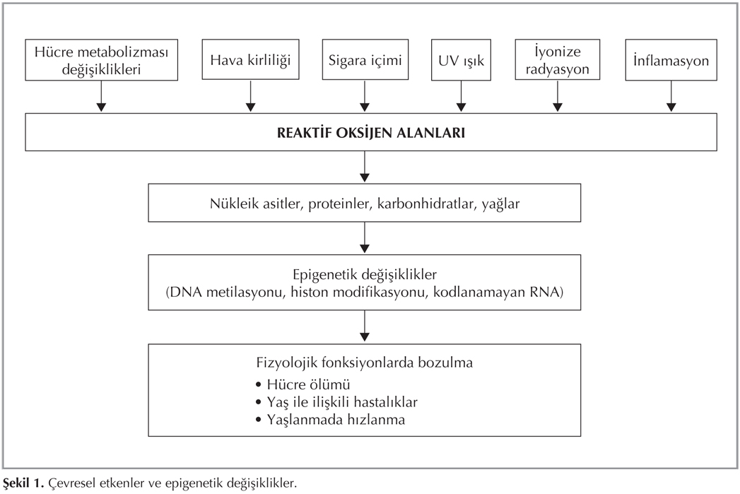 ?lk kez 1942 y?l?nda Waddington taraf?ndan gen-?evre etkile?iminden s?z edildi?inden beri bu konuda yap?lan ara?t?rmalarda pek ?ok ?evresel fakt?r?n reaktif oksijen alanlar?yla ili?kili olarak n?kleik asit, protein, karbonhidrat ve ya?larda yap?sal bozukluklar ile epigenetik etkilerini meydana getirdi?i d???nd?rmektedir (16). ?ekil 1'de ba?l?ca ?evresel fakt?rler ve etkileri g?r?lmektedir (17). G?ncel yay?nlar ast?m olu?um basamaklar?nda epigenetik defektlerin rol?n? ortaya koymaktad?r. Epigenetik mekanizmalar ile reg?le edilen ast?m ile ili?kili pek ?ok gen oldu?u bilinmektedir. Gestasyonel d?nemde Th2 fenotipine d?n???mde g?r?len hipermetilasyon allerjik hava yolu hastal?klar? riskini art?rmaktad?r (18). Ya?lanmada DNA metilasyonu ve gen ekspresyonunda de?i?ikliklere yol a?abilir (19). Sigara i?imi alveoler makrofajlarda t?m histon deasetilaz (HDAC) ve HDAC2 aktivitesini bask?layarak inflamatuvar mediyat?rlerin (GM-CSF, IL-8, IL-1β, TNF-α) ekspresyonunu art?rmaktad?r (20). Yap?lan ?al??malarda gebelik d?neminde annenin sigara i?mesinin ?ocuklarda ast?ma yatk?nl??? art?rd??? g?r?lm??t?r (21,22). Ayr?ca, folat ve metiyonin gibi metil don?rlerinin diyetteki yetersizli?i global bir hipometilasyona yol a?arak ast?m olu?umuna katk?da bulunabilir.