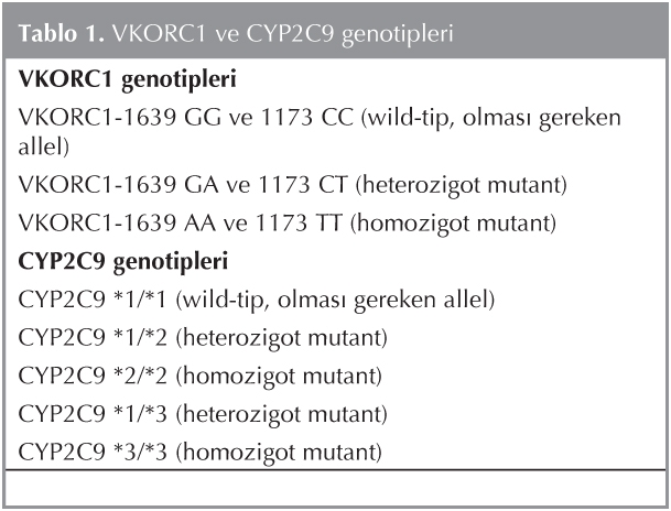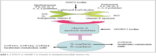 Sitokrom P450 (CYP) endojen steroidleri, yabanc? kimyasal madde ve ila?lar? metabolize eden bir enzim s?per ailesidir. Bu ailenin, bir ?yesi olan CYP2C9, warfarin metabolizmas?nda ?nemlidir (1). Hepatik CYP2C9 warfarinin daha aktif izomeri olan S-warfarinin metabolizmas?ndan sorumludur. CYP2C9'un aktivitesinde azalmaya sebep olan birka? CYP2C9 polimorfizmi saptanm??t?r. Bu azalm?? serum aktivitesi warfarin seviyelerinde artmaya neden olur. Bu da terap?tik INR'ye ula?mak i?in daha d???k dozlar?n yeterli olmas?n? sa?lar, b?yle hastalarda, di?er hastalarda normal olan dozlar kanamaya neden olabilir (7). CYP2C9 genindeki polimorfizm d???nda warfarin dozunu etkileyen di?er genetik varyasyon Vitamin K metabolizmas?ndan sorumlu VKORC1 genindeki polimorfizmlerdir. Warfarin doz ?e?itliliklerinin yakla??k olarak %30'u bu iki polimorfizmden dolay? olmaktad?r (4). Aithal ve arkada?lar? ilk olarak 1999 y?l?nda CYP2C9 gen varyantlar?n?n warfarin metabolizmas?nda de?i?ikliklere neden oldu?unu bulmu?lard?r (15). VKORC1 gen varyantlar? ise 2004 y?l?nda saptanm??t?r (16) (Tablo 1).