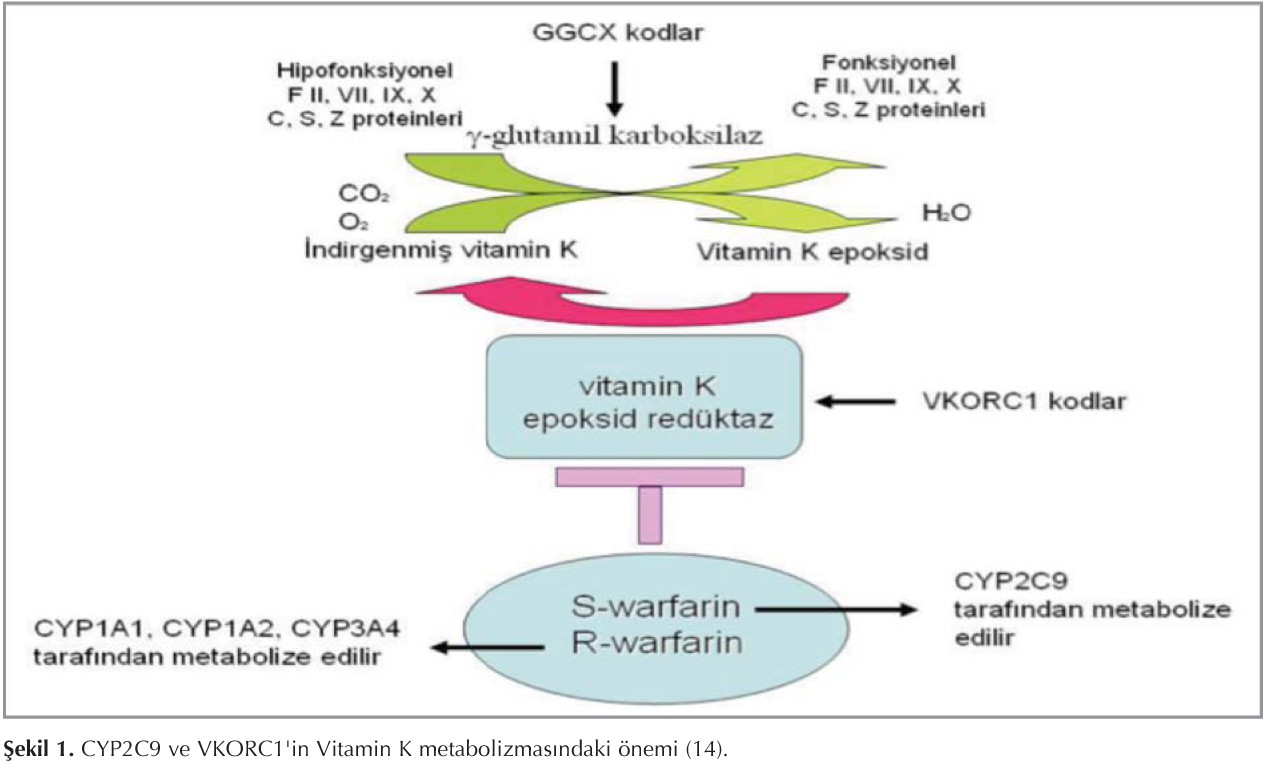 Klinik olarak kullan?lan warfarin %50 R-warfarin ve %50 S-warfarinin rasemik bir kar???m?d?r. Sitokrom p450 2C9 S-warfarininin aktif metabolitleri olan 6-hidroksi-S-warfarin ve 7-hidroksi-S-warfarine d?n???m?n? katalize eder. R-warfarin metabolizmas?ndan sorumlu olan sitokrom P4501A2, 2C19 ve 3A4R-warfarininin aktif metabolitleri olan 6-hidroksi-R-warfarin ve 7-hidroksi-R-warfarine d?n???m?n? katalize eder. S-warfarinin metabolik eliminasyonu R-warfarinden ?? kat daha h?zl?d?r. R-warfarinle kar??la?t?r?ld???nda S-warfarin VKOR enzim inhibit?r? olarak be? kat daha aktiftir (3,7).