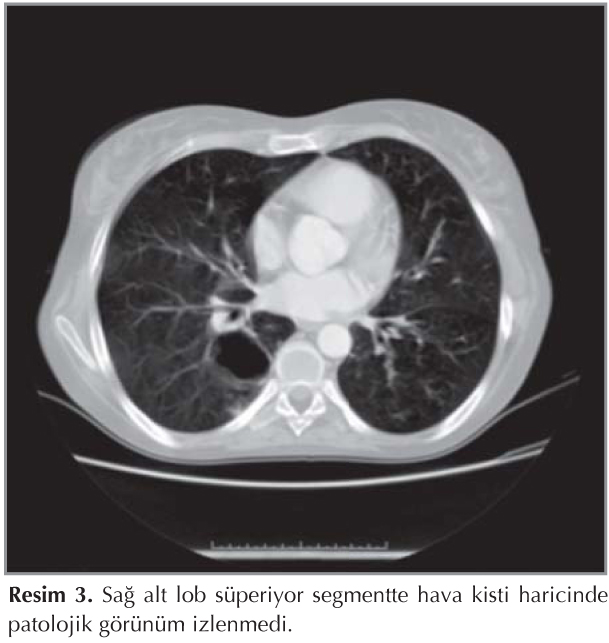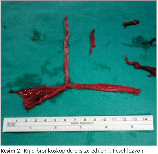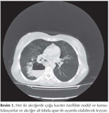 Otuz ?? ya??nda kad?n hasta ciddi epistaksis nedeniyle acil servise ba?vurdu. Konv?lziyon ge?iren ve fazla miktarda kanaman?n akci?ere aspirasyonu sonucu akut solunum yetmezli?i geli?en olgu ent?be edilerek invaziv mekanik ventilat?r deste?i ba?land?. Yo?un bak?m ?nitesinde yap?lan de?erlendirmesinde hastan?n b?brek fonksiyon testlerinin ileri derecede bozulmu? oldu?u g?r?lerek hemodiyaliz tedavisi ba?land?. Olgunun ?z ge?mi?inde b?brek fonksiyon bozuklu?u nedeniyle b?brek biyopsisiyle fokal sklerozan glomer?lonefrit tan?s? ald??? ve yakla??k alt? ayd?r sistemik steroid (40 mg metilprednizolon) ve siklosporin kulland??? ??renildi. Hemodiyaliz tedavisinin ikinci g?n?nde femoral vene tak?lan kateterde akut tromboz olmas? ?zerine ?ekilen BT anjiyoda sol ana iliyak ven bifurkasyon ?ncesinde, internal iliyak ven proksimalinde, eksternal iliyak vende de?i?ik derecelerde dolum defekti izlenen olguya d???k molek?ler a??rl?kl? heparin (DMAH) tedavisi ba?land?. Akci?er grafisinde sa?da orta zonda ve solda ?st zonda infiltrasyonlar izlendi. ?ekilen toraks BT'sinde her iki akci?erde ?o?u kaviter ?zellikte nod?l ve konsolidasyonlar, akci?er alt lobda apse ile uyumlu olabilecek lezyon g?r?ld? (Resim 1). Ay?r?c? tan?da ?ncelikle septik emboli d???n?len olguya ampirik antibiyotik tedavisi ba?land?. Tedavisinin be?inci g?n?nde ekst?be edilen hasta ileri tetkik ve tedavi i?in klini?imiz yo?un bak?m ?nitesine al?nd?. Olgunun fizik muayenesinde vital bulgular? normal s?n?rlarda izlendi. Olgunun mukozalar? soluktu ve ciltte burun ?zerinde ve a??z kenarlar?nda telanjiektaziler g?r?ld?. Solunum sistemi muayenesinde bilateral ince raller duyuldu. Kalp muayenesinde ?f?r?m duyulmad?. ?z ge?mi?i sorguland???nda tekrarlayan abortus ?yk?s? oldu?u ??renildi. Ald??? antibiyotik, DMAH ve steroid tedavisine devam edilen olguda epistaksis tekrarlad?. DMAH tedavisi kesildi. Tedaviye ra?men kanamas? durmayan ve tampon de?i?tirilmesi s?ras?nda kanamas? artarak asfiksi geli?en hasta yeniden ent?be edilerek mekanik ventilat?re ba?land?. Kontrol akci?er grafisinde sol akci?erde totale yak?n atelektazi izlendi. Endotrakeal t?p yoluyla fiberoptik bronkoskopi ile de?erlendirildi. Trakea alt ucundan kaynaklanan ve sa? ve sol ana bron?lar? obstr?kte eden ve bronkoskopun ilerlemesini engelleyen lezyon saptand?. G???s cerrahisi ile kons?lte edilerek rijid bronkoskopisi yap?ld? ve kitlesel lezyon eksize edildi (Resim 2). Bron? lavaj patoloji sonucu fibrin ve mantar elemanlar? olarak raporland?. ?ntraven?z kaspofungin tedaviye eklendi. Kontrol akci?er grafisinde atelektazinin d?zeldi?i izlendi. Yo?un bak?m izleminde hematokezya geli?ti. Sistemik steroid tedavisi kesildi. Kanama profili normal izlendi. ?zlemde kanamas? olmayan hastaya ek cerrahi giri?im d???n?lmedi. Yo?un bak?m yat???n?n alt?nc? g?n?nde ate? y?ksekli?inin devam etmesi sebebiyle tedaviye teikoplanin eklendi. ?zlemde mekanik ventilasyonda spontan modda takibe al?nan ard?ndan T t?p ile oksijen deste?i alt?nda izlenen hastan?n sat?rasyonlar?nda d??me olmamas? ve hemodinamisinin de stabil seyretmesi ?zerine yo?un bak?m yat???n?n 14. g?n? ekst?be edildi. Ate? y?ksekli?i, oryantasyon, kooperasyon bozuklu?u olmas? ve konu?amama ?ikayetleri ile n?roloji taraf?ndan de?erlendirildi. Beyin MR'sinde sol insular korteks d?zeyinde akut iskemiye i?aret eden dif?zyon k?s?tlanmas? izlendi. Kanama zaman? in vitro trombosit fonksiyon testi (COL-EPI, PFA-100) ile de?erlendirilerek normal bulundu. Lupus antikoag?lan? negatif, antikardiyolipin antikor IgM ve IgG negatif, anti-β2-glikoprotein I IgM 5.6 MPL U/mL, IgG 8.4 GPL U/mL, IgA 6.0 U/mL olarak geldi. Di?er romatizmal mark?rlar? negatif gelen hastada primer antifosfolipid antikor sendromu (APS) d???n?lerek sistemik steroid tedavisi ba?land? (1). ?zleminde ate? yan?t? al?nd? ve klini?inde belirgin d?zelme izlendi. Kontrol toraks bilgisayarl? tomografisinde sa? alt lob s?periyor segmentte hava kisti haricinde patolojik g?r?n?m izlenmedi (Resim 3). Klinik ve radyolojik de?erlendirmede stabil olan hasta taburcu edildi.