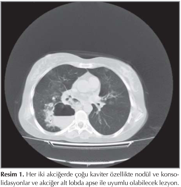 N?rolojik semptomlar, akci?erde kaviter lezyonlar, apse, nod?l ve konsolidasyon alanlar? ile karakterize pulmoner hastal?k, cilt tutulumu, solunum ve b?brek yetmezli?i ile yo?un bak?m ?nitesinde izlenen ve katastrofik tip antifosfolipid antikor sendromu (CAPS) tan?s? konulan bir kad?n olguyu sunuyoruz.