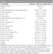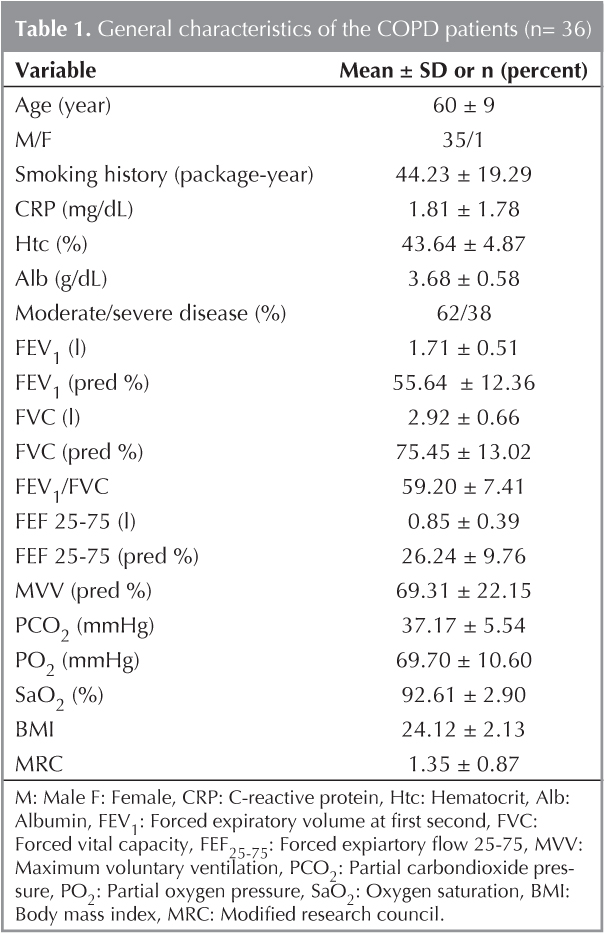 This study prospectively enrolled 36 (1 female, 35 males) clinically stable COPD patients with a mean age of 60 ? 9 years between December 2007 and June 2008. All patients were categorized based on the GOLD criteria (5).