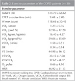 The mean CPET exercise time was 9.48 ? 2.06 minutes while the mean 6 minute walking distance was 513.70 ? 68.68 meters. Data related to the exercise capacity of COPD patients were given on Table 2.? Thirty patients could complete the CPET while 6 patients could not. Among those who could not complete CPET, 4 had severe and 2 had moderately severe COPD. CPET was terminated because of dyspnea in 13 (43.3%) patients, leg fatigue in 15 (50%) patients, and a high blood pressure response during the test in 2 (6.7%) patients.