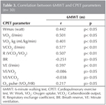 6MWT was significantly correlated with maximal exercise test parameters, maximum work (Wmax), maximum heart rate (HRmax), oxygen uptake (VO2), corbondioxide output (VCO2) respiratory exchange ratio (R), and minute ventilation (VE) (Table 3).