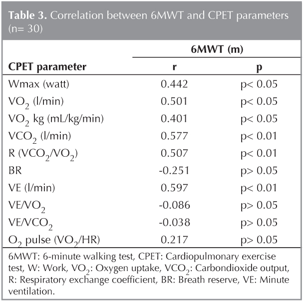 The data of six subjects were excluded from the statistical analysis due to failure to complete cycle ergospirometry because of unfamiliarity with cycling. CPET requires a more advanced technology, high patient compliance, and continuous monitorization during the test. However, Turkish population is more familiar to walking as a daily activity than cycling, and it is also easy to adopt for them. This may explain the high patient compliance with corridor walking test. Some previous studies have also reported a higher patient compliance to 6MWT.
