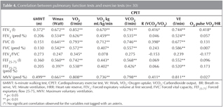 Results: Maximum oxygen uptake was significantly correlated with 6 minute walking distance. Both exercise tests were correlated with pulmonary function tests. However, maximum exercise capacity was more closely correlated with measures of lung function than 6MWT. Both tests were significantly correlated with static lung volumes. Inspiratory capacity (IC) was significantly correlated with 6MWT and CPET parameters. CPET was significantly correlated with diffusion capacity and maximal inspiratory pressure. Airway conductance and resistance tests showed no correlation with the exercise tests.