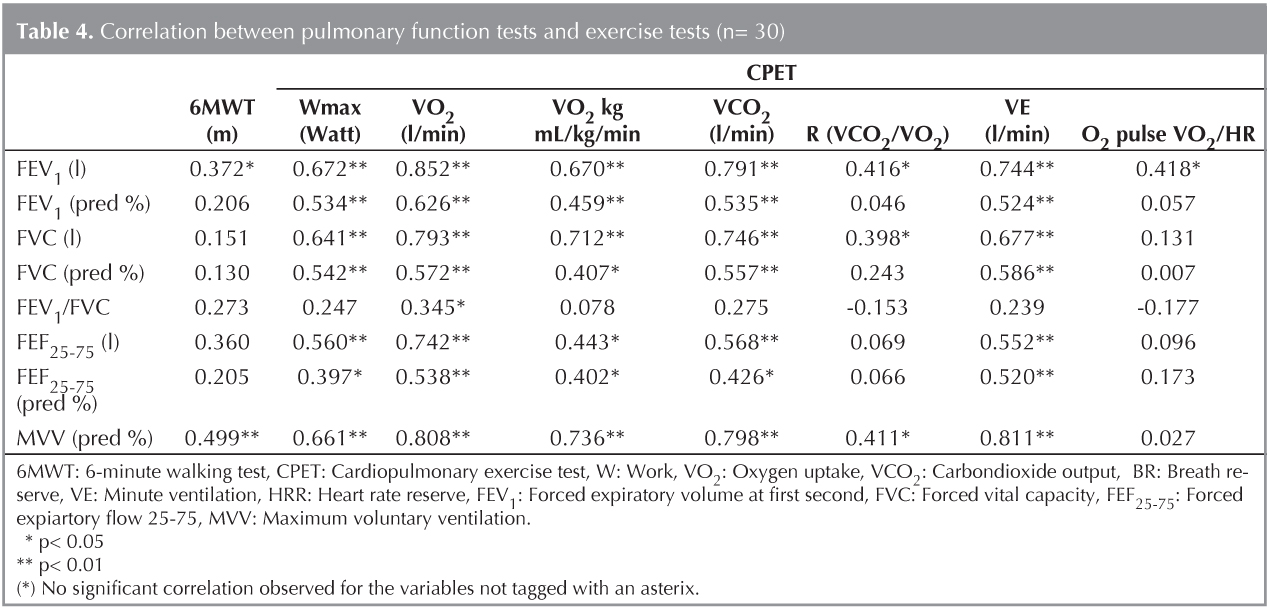 Comparison of the six minute walking distance and the pulmonary function test parameters showed that FEV1 and MVV were significantly correlated with 6MWT. VO2 (L/dk) and VO2 (pred %)? were significantly correlated with all pulmonary function test parameters. Wmax, VE, VCO2 and VO2 kg were significantly correlated with FEV1 (L), FEV1 (%), FVC (L), FVC (%), FEF 25-75 (L), FEF 25-75 (%), and MVV. VE/VO2, VE/VCO2, and BR were not correlated with any pulmonary function test parameter. As a result, both exercise tests were correlated with FEV1 and MVV. However, maximum exercise capacity was more closely correlated with lung function measures than six-minute walking distance (Table 4).