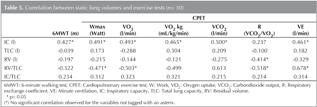 The relationship between both exercise tests and static lung volumes was also assessed. 6MWT was correlated with IC. There were significant correlations between VE (l/min) and IC, RV/TLC; Wmax, VO2 kg (mL/kg/min) and VCO2, IC, RV/TLC. R value was negatively correlated with RV and RV/TLC (Table 5). The analysis of the correlation between exercise tests and lung volumes revealed significant correlation between IC and both tests. CPET parameters were correlated with RV/TLC, an indicator of air trapping.