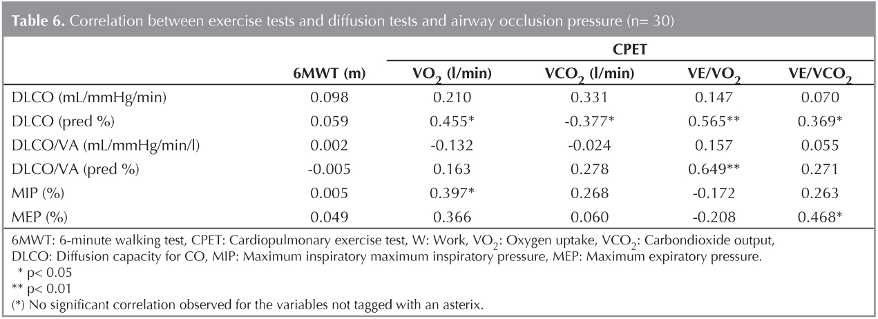 No significant correlation was observed between 6MWT and the diffusion test. DLCO (ml/mmHg/min) was positively correlated with HRR. VO2, VCO2, VE/VO2, VE/VCO2 were significantly correlated with DLCO (pred %) and MIP (%). There was a significant correlation between DLCO/VA and VE/VO2 (Table 6).