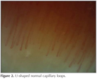Minor abnormalities: 7-10 capillaries/mm, less than 50% tortuous loops, arranged in parallel rows, with no hemorrhages or neoangiogenesis aspect;
