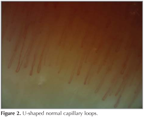We categorized issues as major abnormalities when at least one of the following findings were determined: ectazic capillary, micro-hemorrhages, neoangiogenic aspects (bushy, bizarre, or meandering loops), decreased capillaries, or tortuosity more than 50%. A recent study showing the capillaroscopic findings in healthy subjects has shown that the most frequent morphologic features are U-shaped loops and tortuous loops, with 7-10 capillaries per millimeter (19). Bushy, crossed, and meandering capillaries, as well as pericapillary hemorrhages, are not frequently observed in healthy subjects (19). So, the findings that we grouped as major abnormalities in our study had not been observed in healthy subjects, however, minor abnormalities, as we described loops with less than 50% tortuosity, can be seen in healthy subjects as well.