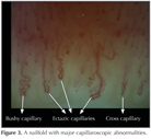 Major abnormalities: decreased capillary density, more than 50% tortuous, enlarged, and/or disarranged loops, with hemorrhages; more than 50% neoangiogenesis, ectazie, and/or microhemorrogia.