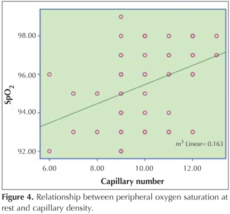 Table 3 shows the capillaroscopic findings according to lung patterns. Capillaries per millimeter were 8.7 ? 1.64, 10.1 ? 1.20, and 10.9 ? 1.34 in patients with UIP pattern, NSIP pattern, and in the control group, respectively. The difference was statistically significant between these groups (p= 0.001). This difference was due to the UIP pattern; patients with a UIP pattern had lower capillary numbers compared to patients with the NSIP pattern and the control group, (p values were 0.008 and < 0.001, respectively. There was a positive correlation between SpO2 measured at rest and capillary density (Figure 4).