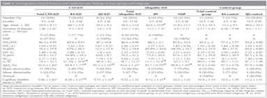 Materials and Methods: We grouped patients into three main groups: 15 CTD-ILD, 18 idiopathic ILD, and 17 patients in the control group. The CTD-ILD group was split into two subgroups: 8 patients with Sj?gren's syndrome (SJS)-associated ILD and 7 with rheumatoid arthritis (RA)-associated ILD. The idiopathic-ILD group consisted of 10 idiopathic NSIP and 8 IPF patients. The control group consisted of 10 SJS and 7 RA patients without lung disease. None of the patients were on acute exacerbation at the time of examination, and none had Reynaud's phenomenon.
