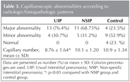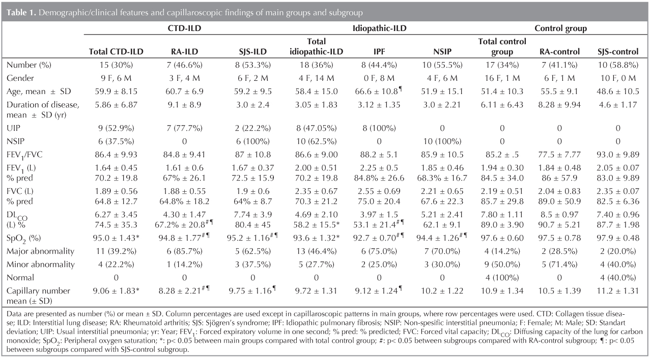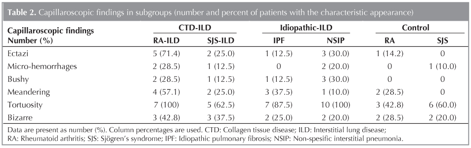Results: Mean capillary density was significantly reduced only in the CTD-ILD group as compared to the control group (p= 0.006). In subgroup analysis, it was determined that RA-ILD, IPF, and SJS-ILD subgroups had more severe capillaroscopic abnormalities. Mean capillary density in patients with the UIP pattern was reduced compared to patients with the NSIP pattern and those in the control group; p values were 0.008 and < 0.001, respectively.