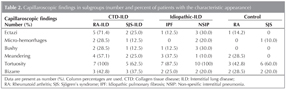 None of the patients had megacapillaries, avascular areas, or a specific scleroderma pattern. Table 2 shows the number of patients with certain capillaroscopic findings for each subgroup.