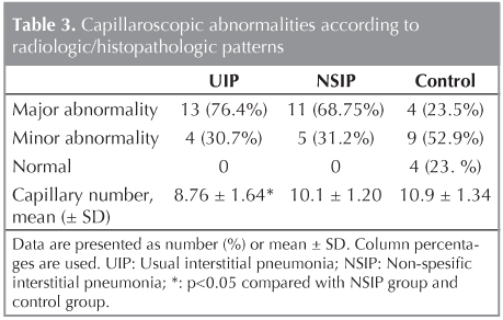 Conclusion: This study is to be the first describing and comparing the nailfold capillaroscopic findings of patients with NSIP and UIP patterns. NFC findings can be helpful in discriminating UIP patterns from NSIP patterns. But to show its role in differentiating idiopathic disease, more studies with more patients are needed.