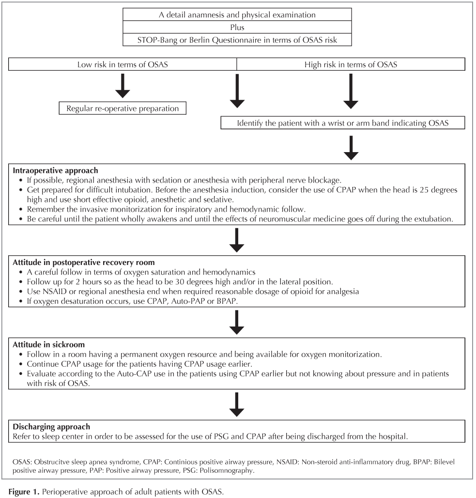 OSAS is a commonly encountered sickness increasing the perioperative complication risk among people. Additionally, a significant proportion of the patients with OSAS have not been diagnosed yet. For the patients being suspected from OSAS in the physical examination and anamnesis, PSG should be done first, if not possible, inquiries defining the OSAS risk should be held. After the inquiry, is the OSAS risk seems high, these expected surgical individuals should be treated as if they were OSAS diagnosed patients. If particularly opioid and neuromuscular blocking agent is to be used in this patient group, short-acted drugs should be preferred as far as possible. A reliable anesthesia plan in terms of anesthesia must be designed for these individuals. CPAP application is considered appropriate in the preoperative and postoperative periods; however, prospective studies are needed about the application method and duration.