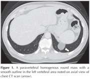 A 59-year-old man with no symptom was referred for a paravertebral homogenous round mass with a smooth outline in the left vertebral area incidentally noted on axial view of chest computed tomography (CT) scan (Figure 1). He had no medical history. The coronal and sagittal images of chest CT scan revealed continuity of the soft tissue line of the left diaphragm adjacent to the mass and protrusion of retroperitoneal fat into the thoracic cavity through diaphragmatic defect (Figure 2). Therefore, the patient was diagnosed to have Bochdalek hernia. As the patient had no symptom and benign nature of the disease, surgical resection was not performed.
