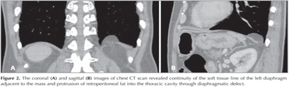 Bochdalek hernia is one of the most common types of diaphragmatic hernia (1). Chest radiograph is a pivotal role as the first-line for detection of various kinds of chest diseases, although imaging for diagnosis of the disease is mainly based on conventional axial sections of CT scan. In these images, diaphragmatic hernias were sometimes misdiagnosed as other diseases in lung parenchyma (2,3). The coronal and sagittal images of CT scan as well as? magnetic resonance imaging (MRI) for a Bochdalek hernia are characteristic enough for making a definitive diagnosis and render other diagnostic modalities unnecessary (4,5). Although very rare, physicians should be taken this disease into differential diagnosis in case with paradiaphragmatic mass lesion.