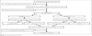 We conducted a prospective, cross-over study at the sleep laboratory of a university hospital over a 12-month period. Demographic characteristics, body mass indices (BMI), neck circumference, Epworth sleepiness scale (ESS), co-morbidities, and alcohol, drug, and smoking histories were recorded before the study. All subjects planned to undergo both 7-hours nPSG and 7-hours dPSG and were randomized into two groups: the first had nPSG before dPSG, while the other group had dPSG before nPSG (Figure 1). Patients were warned to not be sleep-deprived before the PSG sessions. The time interval between the two PSGs was 48-72 h. nPSG was performed from 00:00-07:00 hours and dPSG from 10:00-17:00 hours.