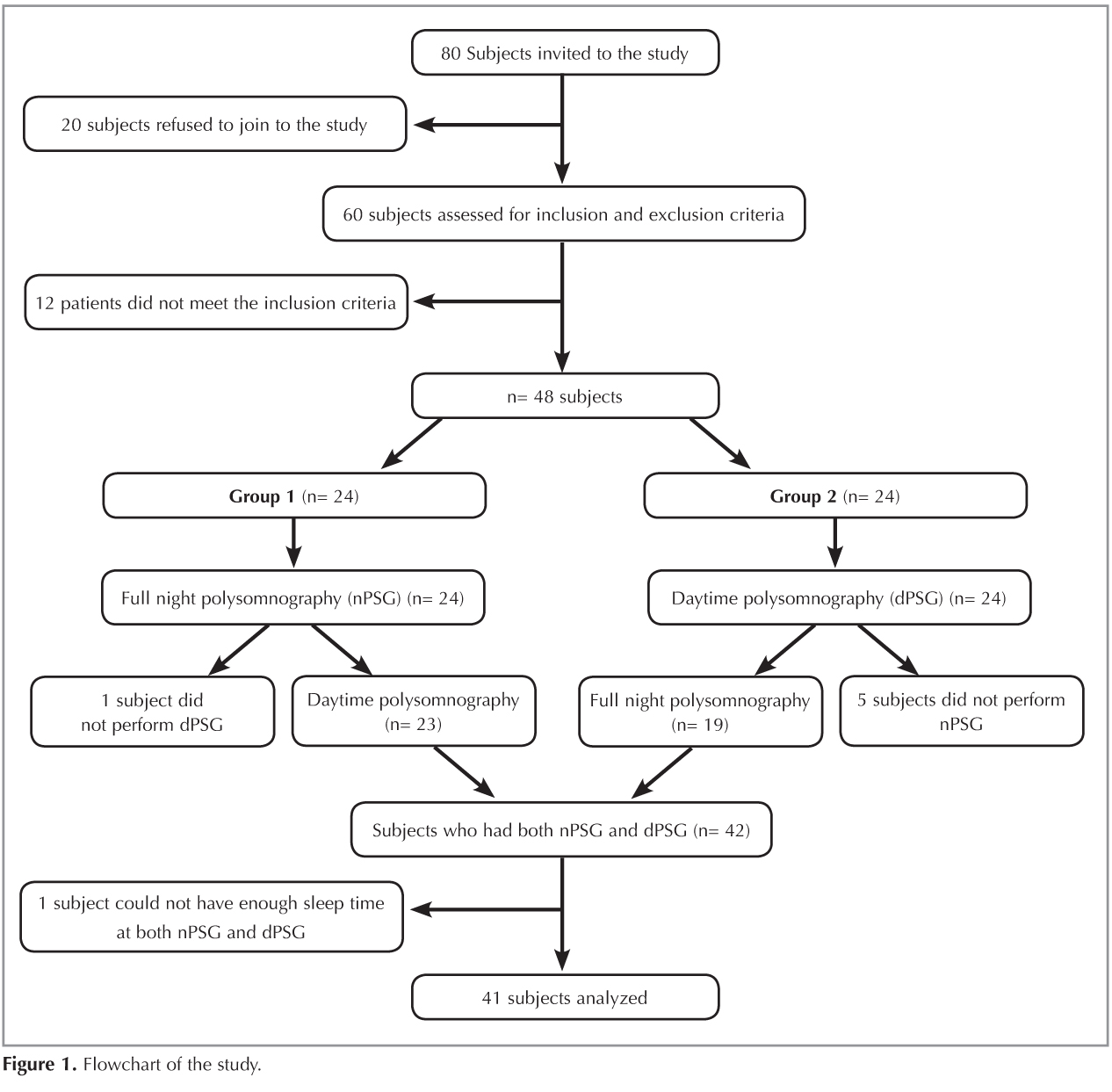 The aim of the study was to assess the role of daytime PSG in the diagnosis and evaluation of SAS, and the correlation between nPSG and dPSG.