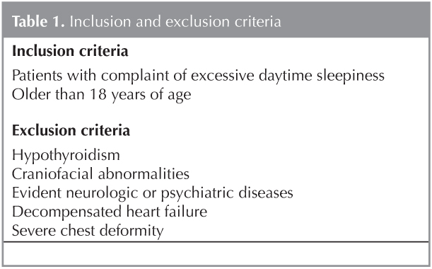 We recruited consecutive patients referred to our laboratory with complaints of snoring and EDS over a 12-month period. Eighty subjects were invited to participate in the study; 20 refused to participate. Sixty subjects who were willing to participate were invited to the sleep laboratory and evaluated for exclusion criteria by a sleep physician. Twelve subjects were excluded, leaving 48 who participated in the study. The inclusion and exclusion criteria are presented in Table 1.
