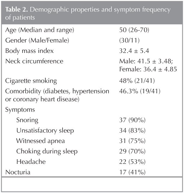In total, 48 subjects were included in the study. Six subjects did not participate in nPSG or dPSG PSG and one subject did not have sufficient sleep time at the PSG sessions. These seven subjects were excluded; therefore, data for 41 subjects (30 males, 11 females) were analyzed (Figure 1). Their median age was 50 (26-70) years and their mean BMI was 32.4 ? 5.4. Nineteen patients (46.3%) had one or more comorbidities (hypertension, diabetes, or coronary artery disease), but there was no correlation between comorbidities and SAS severity (p = 0.46). Demographic characteristics and symptoms are provided in Table 2. The mean ESS score was 11.3 ? 5.94. There was no correlation between ESS score and symptoms (p< 0.05) but not with comorbidities (p> 0.05). Twenty one patients were current or former smokers, but there were no correlations between smoking and sleep parameters, BMI, or neck circumference (p> 0.05).