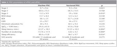 Sleep latencies of the patients in nPSG and dPSG were 12.2 ? 10.2 and 22.3 ? 18.2, respectively (p< 0.005). Awake periods were less common in nPSG than dPSG (6.6 ? 4.2 vs. 13.7 ? 11.9, p< 0.001). Both differences were statistically significant, favoring nPSG.