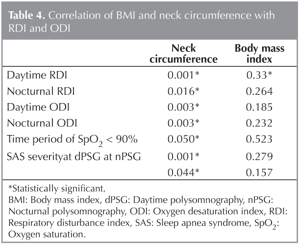 Mean neck circumference was 40.29 ? 4.1 cm (males: 41.5 ? 3.48 cm, females: 36.4 ? 4.85 cm). There were positive correlations between neck circumference and nocturnal RDI and daytime RDI (p< 0.001), ODI (p< 0.05), severity of SAS (p< 0.001), and duration of SpO2 < 90% (p< 0.05) (Table 4). However, there was no correlation between ESS and neck circumference (p= 0.69).