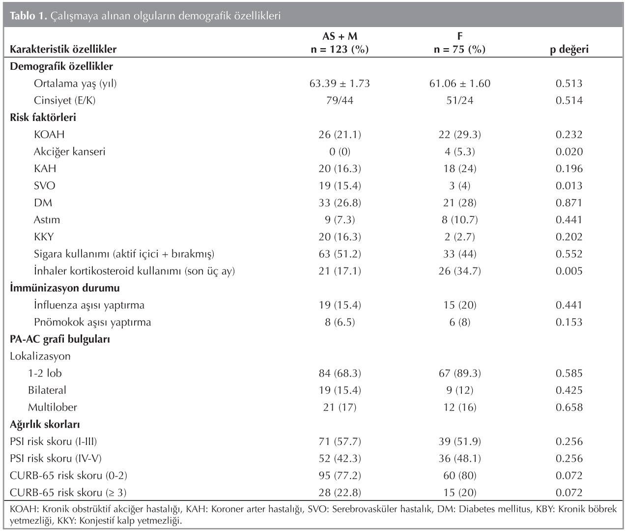 ?al??mada TGP tan?s? alan ve ?al??ma kriterlerini ta??yan 225 hasta yer ald?. Di?er antibiyotik tedavilerini alan 27 ki?i ?al??ma d??? b?rak?ld?. Hastalar?n 123'? AS + M (%54.6) ve 75 (%33.3)'i F tedavisi alm??t?. Has-talar?n 68 (%34.3)'i kad?n, 130 (%65.7)'u erkekti ve ya? ortalamas? 62 idi. ?al??maya al?nan hastalar?n 168 (%84.8)'inde bir veya daha fazla komorbid hastal?k e?lik etmekteydi. En s?k g?r?len komorbid durumlar diabetes mellitus (DM), kronik obstr?ktif akci?er hastal??? (KOAH) ve koroner arter hastal??? (KAH) idi.Serebrovask?ler olay? (SVO) olan hastalar AS + M grubunda ve akci?er kanseri olan hastalar F grubunda belirgin olarak daha fazla idi. ?nfluenza a??s? yapt?rma oran? AS + M grubunda %15.4, F grubunda %20 olarak saptand?. AS + M grubundaki hastalar?n %6.5'i, F grubundakilerin %8'i pn?mokok a??s? ile a??lanm??t?. ?al??maya al?nan olgular?n demografik ?zellikleri Tablo 1'de ?zetlenmi?tir.
