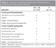 Balgam k?lt?r?nde AS + M grubunda 11 (%8.9), F grubunda 7 (%9.3); kan k?lt?r?nde ise AS + M grubunda 6 (%4.9), F grubunda 1 (%1.3) olguda ?reme saptand?. En s?k ?reyen ajan Streptococcus pneumoniae idi. Tablo 2'de etken da??l?mlar? g?r?lmektedir.