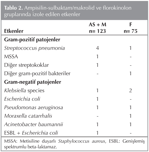 ?al??mam?zda tedavi ba?ar?s?zl??? AS + M grubunda %17.9, F grubunda ise %12 idi ve gruplar aras?nda istatistiksel bir fark yoktu. Kothe ve arkada?lar?n?n ?al??mas?nda, ampirik olarak beta-laktam ? makrolid veya solunum florokinolonlar? ba?lanan hastalarda 65 ya? alt? 1.298 hastan?n %25.4'?nde ve 65 ya? ?st? 1.349 hastan?n %32.6's?nda tedavi ba?ar?s?zl???na ba?l? ba?lang?? antibiyotik tedavisinde de?i?iklik yap?lm??t?r (24).