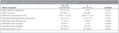 Bulgular: TGP tan?s? alan ve ?al??ma kriterlerini ta??yan 198 hasta ?al??mada yer ald?. 198 olgunun 123'? AS + M (%54.6) ve 75 (%33.3)'i F tedavisi alm??t?. Hastalar?n 68 (%34.3)'i kad?n, 130 (%65.7)'u erkekti ve ya? ortalamas? 62 idi. En s?k komorbid durumlar diabetes mellitus, kronik obstr?ktif akci?er hastal???, konjestif kalp yetmezli?i ve koroner arter hastal??? idi. Ba?vurudaki hastal?k a??rl???, ya?, cinsiyet, komorbid hastal?klar, sigara i?me durumu, laboratuvar bulgular?, CURB-65 ve PSI skorlar? her iki grupta da benzerdi. Klinik ba?ar? oranlar? a??s?ndan F kullanan ve AS + M kullanan hastalar aras?nda bir farkl?l?k saptanmad? (s?ras?yla %88, %82.1, p= 0.314). Hastane i?i mortalite AS + M grubunda %5.6, F grubunda %6.6; 30 g?nl?k mortalite AS + M grubunda %8.1, F grubunda %8; 90 g?nl?k mortalite AS + M grubunda %20.3, F grubunda %19; 1 y?ll?k mortalite AS + M grubunda %31.7, F grubunda ise %26.9 idi. Ortalama yat?? maliyeti (s?ras? ile 1.963 ? 3.723 TL, 1.965 ? 7.172 TL), yat?? s?releri (AS + M grubunda 5.6 ? 3.9 g?n, F grubunda 5.9 ? 3.9 g?n) ve mortalite oranlar?nda bir farkl?l?k saptanmad?.
