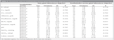 Ventilat?rden ba?ar? ile ayr?lan ve ayr?lmada ba?ar?s?z olunan hastalar?n yat??ta ve ventilat?rden ay?rma g?nlerindeki baz? elektrolit, alb?min ve prealb?min de?erleri, b?brek fonksiyon testleri ve arter kan gaz? de?erleri Tablo 2'de sunulmaktad?r. Ba?ar?s?z grupta ba?ar?l? gruba g?re yat?? g?n? PaCO2 ve HCO3 de?erleri, ventilat?rden ay?rma g?n? ise BUN ve kreatinin de?erleri daha y?ksekti.