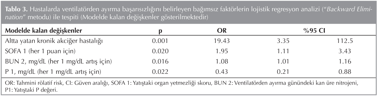 ?kili analizlerde ventilat?rden ay?rma ba?ar? veya ba?ar?s?zl??? ile p< 0.10 d?zeyinde ili?kili ??kan de?i?kenler ve yat?? P de?i?keni lojistik regresyon modeline al?nm??t?r (Tablo 3). Yat?? tan?s? olarak intoksikasyon olmas? say? azl??? ve modelde OR hesaplan?lamamas?, ventilat?rden ay?rma d?nemindeki kreatinin de?i?keninin SOFA 2'de de yer almas? nedenleriyle ya?, BK?, altta yatan kronik akci?er hastal???, APACHE II skoru, SOFA 1 ve SOFA 2 skoru, PaCO2, HCO3, BUN, mekanik ventilasyon s?resi, beslenme tedavisi 2 ve P1 de?i?kenleri modele al?nm??t?r. Buna g?re altta yatan kronik akci?er hastal???, yat?? g?n? y?ksek SOFA skoru, ventilat?rden ay?rma g?n? y?ksek BUN de?eri ve yat?? g?n? d???k P de?eri ventilat?rden ay?rma ba?ar?s?zl???n? belirleyen ba??ms?z fakt?rlerdir. P de?erinde her 1 mg/dL art?? i?in ventilat?rden ay?rma ba?ar?s?zl??? OR 0.43 (0.21-0.88)'dir. Hipofosfateminin ventilat?rden ay?rma ba?ar?s?zl???n? belirlemek ?zere yap?lan ?al??man?n g?c? oranlar aras? farka g?re %30.5; ortalamalar aras? farka g?re %35.3 olarak bulunmu?tur. Di?er bir de?i?le hipofosfatemi ventilat?rden ay?rma ba?ar?s?zl???n?n yakla??k %30'unu a??klamaktad?r.