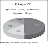 ?alışmaya alınan 149 hastanın yaşları 15-55 yaş arasında değişmekteydi ve 37 (%24.8) erkek, 112 (%75.2) kadından oluşmaktaydı. Standart deri testi paneline g?re ?alışmaya alınan olguların 44 (%29.5)'? duyarlı değil, 105 (%70.5)'i duyarlı idi. Olguların 71 (% 47.7)'i sadece astım tanısı alırken, 78 (%52.3)'inin astım + riniti vardı. Olgulara astım tanısı konulmasından sonra ge?en s?re ortalama 3.5 ? 3 yıldı. Hastaların meslek gruplarına g?re dağılımında en b?y?k grup ev hanımı grubuydu (Şekil 1).