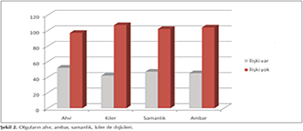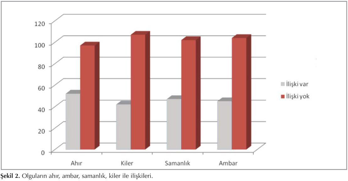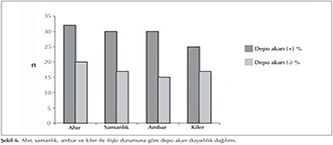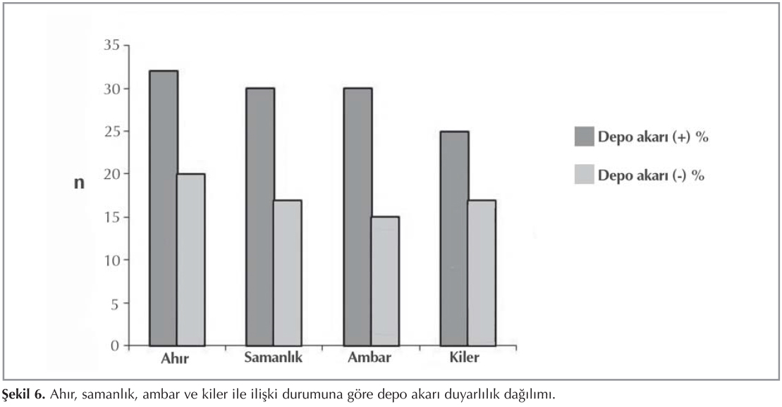 Olgular i?erisinde ambarla ilişkisi olanlarda depo akarı duyarlılığı en fazlaydı. Ambarla ilişkisi olan 45 olgudan 30'unda depo akarlarından en az birisine karşı duyarlılık mevcuttu (p< 0.01). Sırasıyla samanlık ve ahırla ilişkisi olanlarda da depo akarlarına duyarlılık anlamlı derecede y?ksek bulundu (p< 0.01, p< 0.05). Ancak kiler ile ilişkisi olan olgularla depo akarlarına deri testi pozitifliği arasında anlamlı bir ilişki saptanmadı (p> 0.05) (Şekil 6). Olgularımız i?erisinde nemli ev ortamında yaşayan 38 kişiden 25 (%65.8)'inde en az bir depo akarı t?r?ne karşı pozitif reaksiyon vardı (p< 0.01).? Depo akarı duyarlılığı olan olguların yakınmalarıyla mevsimler arasındaki ilişki ise anlamlı değildi (p> 0.05).