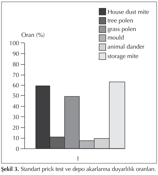 Olgulara uygulanan standart deri testi panelinde en az bir allerjene duyarlılık g?z ?n?nde tutulduğunda olguların 105 (%70.5)'i standart panele pozitif deri reaksiyonu verirken, 44 (%29.5)'? standart panele deri reaksiyonu vermedi. Olgulara uygulanan deri prick testi sonu?larına g?re en y?ksek duyarlılık, depo akarlarına karşıydı. Depo akarlarından en az birine duyarlılık 71 (%61.7) kişide mevcuttu. Ev tozu akarları 67 (%58.3) kişide pozitif reaksiyon veriyordu. Daha sonraki duyarlılık sırası ise ?ayır otu 56 (%48.7) kişi, ağa? polenleri 12 (%10.4) kişi, hayvan t?yleri 10 (%8.7) kişi ve en son sırayı mantarlara duyarlı olan 8 (%7) kişi almaktaydı (Şekil 3). Standart deri testi panelinde duyarlılık saptanmamasına karşın, depo akarlarına pozitif reaksiyon veren 10 kişi mevcuttu.