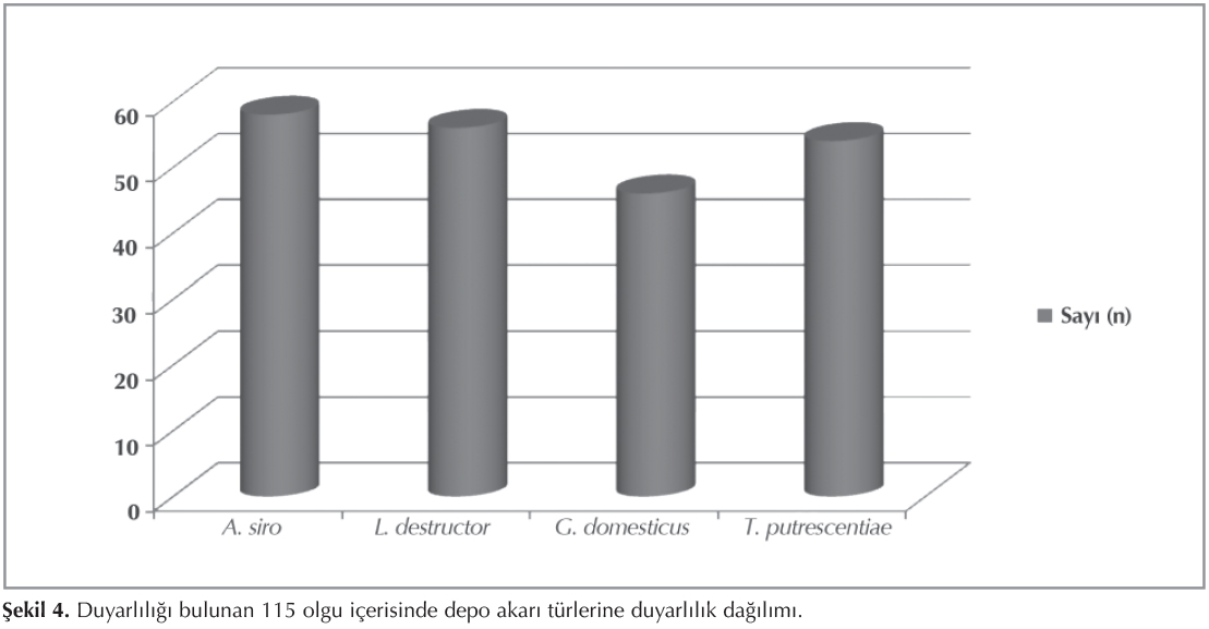 Depo akarları i?erisinde en fazla pozitif deri reaksiyonu veren 58 (%50.4) kişi ile? A. siro idi. Daha sonra sırasıyla L. destructor, T. putrescentiae, G. domesticus gelmekteydi (Şekil 4).