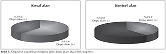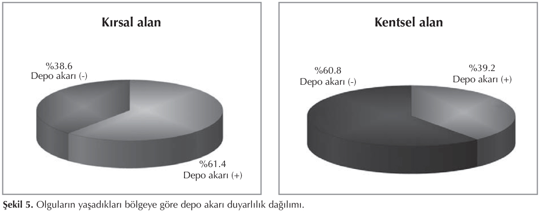 ?alışmamıza katılan olguların yaşadıkları b?lge ve sosyoekonomik durumlarına g?re depo akarı duyarlılığı incelendiğinde kırsal kesimde yaşayan 57 kişinin 35 (%61.4)'i en az bir depo akarına karşı duyarlıydı ve kentsel alanda yaşayanlarla karşılaştırıldığında istatistiki olarak anlamlı bir yığılım mevcuttu (p< 0.01) (Şekil 5).