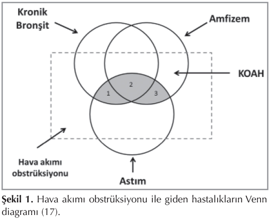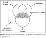 Hava akımı kısıtlaması ile seyreden hastalıklar Şekil 1'de Venn diyagramı ile g?sterildiğinde AKOS'lu hastalar, 1,2,3 nolu alanlara uymaktadır (17). Başka bir anlatımla; persistan hava akımı kısıtlaması g?steren, aynı zamanda? kronik bronşit ve amfizemden biri ya da ikisi olan astımlılar ile değişkenlik ve bronş hiperreaktivitesi (BHR) g?steren KOAH'lılar bu gruba girmektedir. GINA-GOLD ortak kılavuzunda da astım veya KOAH ?zelliklerinden benzer sayıda ?zelliğe sahip olanların AKOS olarak tanımlanabileceği belirtilmektedir (Tablo 1) (1).
