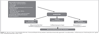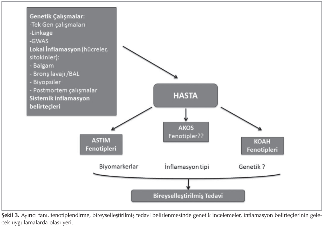COPD Gene kohortunda, AKOS olarak tanımlanan hastalar ve KOAH'lılarda t?m genomun analizinde istatistiksel olarak anlamlı fark g?steren bir SNP (single nucleotide polymorphism) saptanmamıştır. Aynı ?alışmada AKOS'ta beyaz ırktan hastalarda 8. kromozomda yer alan CSMD1 ve 12. kromozomda bulunan SOX5 geninde SNP'ler ve t?m grupta (beyaz ırk ve Afrika k?kenli Amerikalı) 14. kromozomda bulunan GPR65 geninde SNP'lerin olduğu belirlenmiştir. CSMD1 geni amfizemle ilişkilidir. SOX5 geni KOAH ile ilişkili, akciğer gelişiminde rol? olan bir gen olabilir. GPR65 geni ise eozinofil aktivasyonunda rol? olan, proinflamatuvar sitokinlerin inhibisyonunda rol alan bir gendir (4). Astım ve KOAH'ta fonksiyonel ve d?zenleyici yolaklarda rol alan ortak genleri belirlemek ?zere yapılan bir başka analizde ise astım ve KOAH ile ilişkili olan 58 gen belirlenmiş ve yatkınlık genlerinin fonksiyonel ?zelliklerine g?re astımda 12 gen, KOAH'ta 11 gen saptanmıştır. İki hastalık arasında bağlantı analizi yapıldığında 229 ?rt?şen molek?l olduğu ve bu molek?llerin ise "aril hidrokarbon resept?r sinyalizasyonu", "sitokin aracılı imm?n h?creler arası bağlantı iletimi", "glukokortikoid resept?r sinyalizasyonu" ve "makrofajlarda IL-12 sinyalizasyonu ve ?retimi" yolaklarında yer aldıkları g?sterilmiştir. Sonu?ta bu iki hastalık arasında bağlantılarda ?rt?şme g?steren ve hastalıkların patobiyolojisiyle ilişkili ortak ?zellikler olabilir (63). Kronik inflamatuvar akciğer hastalıklarında ?ok sayıda gen farklı fonksiyonel yolları kullanarak ve etkileşimde bulunarak hastalık gelişimine katkıda bulunmaktadır. ?evresel fakt?rler (allerjenler, infeksiyonlar, sigara), bu genlerin ekspresyonu ve aralarındaki bağlantıların d?zenlenmesine etki edebilir.? Obstr?ktif akciğer hastalıklarının ortaya ?ıkışına neden olan gen-?evre etkileşimleri, gelişen lokal ve sistemik inflamasyona ait belirte?ler hem ayırıcı tanıda ve fenotiplerin belirlenmesinde hem de bireyselleştirilmiş tedavilerin oluşturulması i?in gelecek yıllarda araştırmalardan klinik uygulamaya yansıma potansiyeli taşımaktadır (Şekil 3).