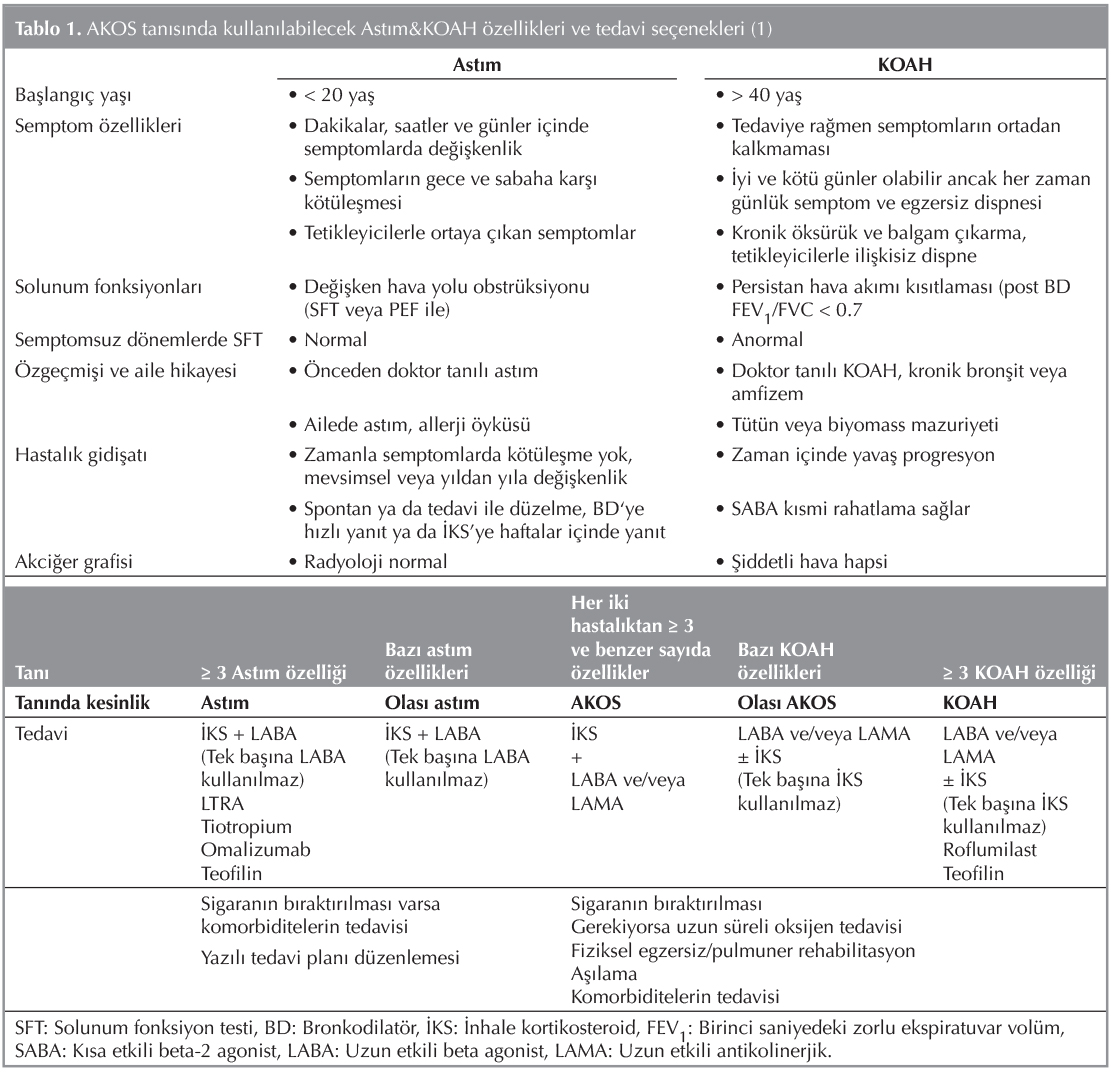 Bug?ne kadar en kapsamlı AKOS tanı ve tedavi ?nerilerine sahip rehberler 2014 GINA ve GOLD rehberleridir (1,47). GINA ve GOLD rehberleri AKOS i?in ilk defa basit ve ?nc?l tedavi ?nerileri getirmiştir (Tablo 1).? GINA ve GOLD, astım ve KOAH karmaşası yaşanan hastaların ?ok iyi incelenmesi gerektiğini ve aslında bir?oğunda astım ve KOAH ayırımının yapılabileceğini belirtmektedir. AKOS'un tanısı birinci basamakta konabilirse de, klinik gidişinin tek başına KOAH ve astımdan k?t? olduğu d?ş?n?lerek bu olguların ileri bir merkeze tanının doğrulanması ama?lı g?nderilmesi ?nerilmektedir. Bu rehberlerdeki algoritmik ve basitleştirilmiş AKOS tanımlaması ?ok sık g?r?len bu sendromu daha iyi anlamayı ve tedavi etmeyi hedefleyen yeni ve ileri araştırmaları cesaretlendirmeyi ama?lamaktadır.