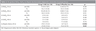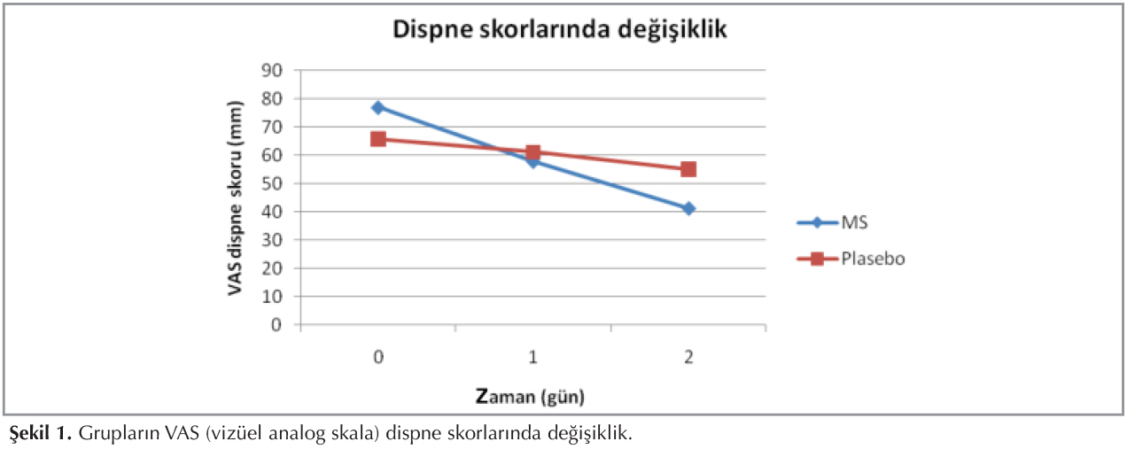 Bazala g?re anlamlı değişiklik g?steren parametreler y?n?nden iki grup arasında yapılan karşılaştırmada, 24. ve 48. saat PaO2 ve SaO2 artışları y?n?nden iki grup arasında anlamlı fark saptanmazken, 24. saatte dispne skorunda bazala g?re değişim MS alan grupta [-19.1 (13.4)],? plasebo alan gruba [-4.7 (6.1)]? kıyasla belirgin olarak fazla bulundu (p= 0.002). Yirmi d?rd?nc? saatte dispne skorundaki d?ş?ş y?zdesi y?n?nden bakıldığında da yine MS alan grupta [-%23.8 (13.6)] plasebo alan gruba [-%9.4 (12.9)] kıyasla belirgin ?st?nl?k saptandı (p= 0.02) (Tablo 4, Şekil 1).